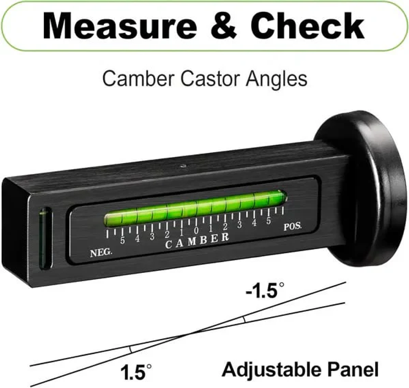 😎Professional Measurement: Camber caster alignment tool has a horizontal adjustment range from -5 to 5 degrees. The large adjustment knob facilitates zeroing the bubble when measuring caster angle.